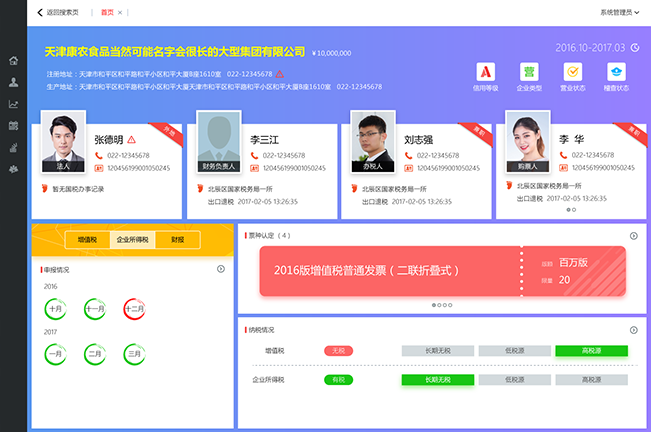 企业及相关人员数据与金三实时对接,准确获取企业及相关人员信息,金三数据加上影像资料,企业及人员详细状况一目了然。